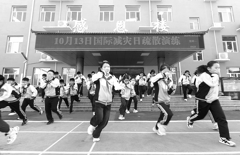 10月13日是国际减灾日,各地开展防灾减灾知识普及和应急疏散演练等活动,以提高市民应急避险与安全自救能力。图为10月13日,石家庄新乐市民生街小学学生在进行防震减灾疏散演练。