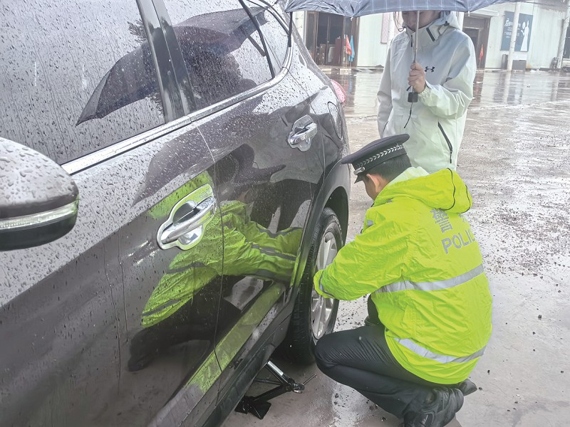 新轮胎顺利装好。面对驾驶人的连连道谢,民警只是笑着摆摆手,便转身继续守护道路通行安全。