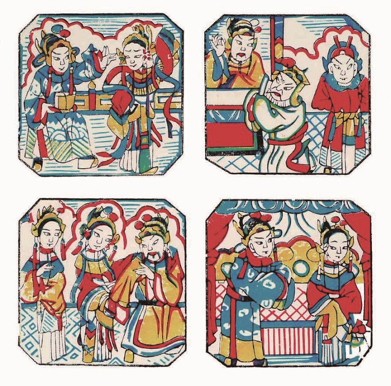在人物动态的处理上,武强年画有意地借鉴戏曲中的“亮相”身段,既有助于强化表现力,又符合群众的美感享受,在一些小幅灯方或窗画中处理得尤其成功。即使是表现近现代生活和人物,也合理地运用这一原则。