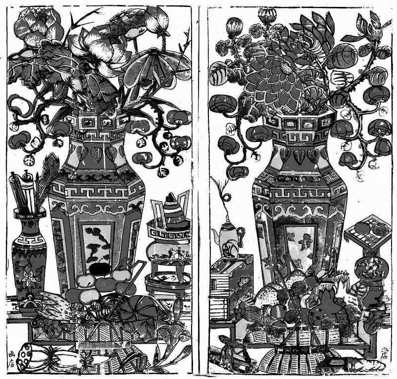 武强年画构图讲究均衡对称,如对狮、对虎、对花瓶、对门神等,都是成双成对。