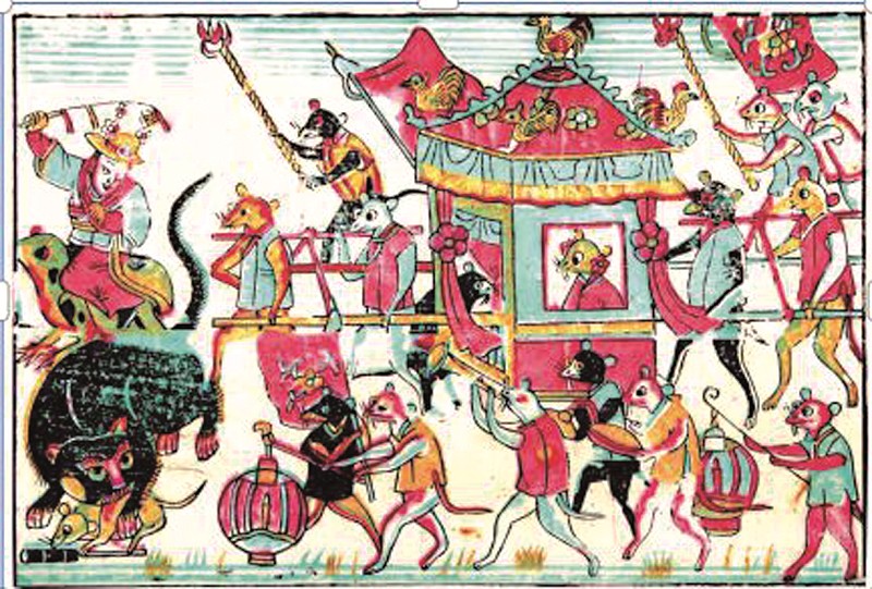 武强年画还常常赋予动物以人情味儿,以拟人化的手法表现童话故事,寓教于乐。无论是娱乐百戏的《猴演杂技》,还是顽皮恶作剧的《猴闹瓜田》;无论是猿猴托印的《富寿年丰》,还是生动活泼的《猴抢草帽》,猴子可谓尽显模仿之能。至于《老鼠嫁女》《蛤蟆娶亲》《水兽迎亲》等,形象滑稽的故事成为人们忍俊不禁的幽默谈资。还有《老鼠告状狸猫诉情》《猫鼠大战》等动物间的争斗也似人类的争战,无论谁胜谁负总有伤亡。