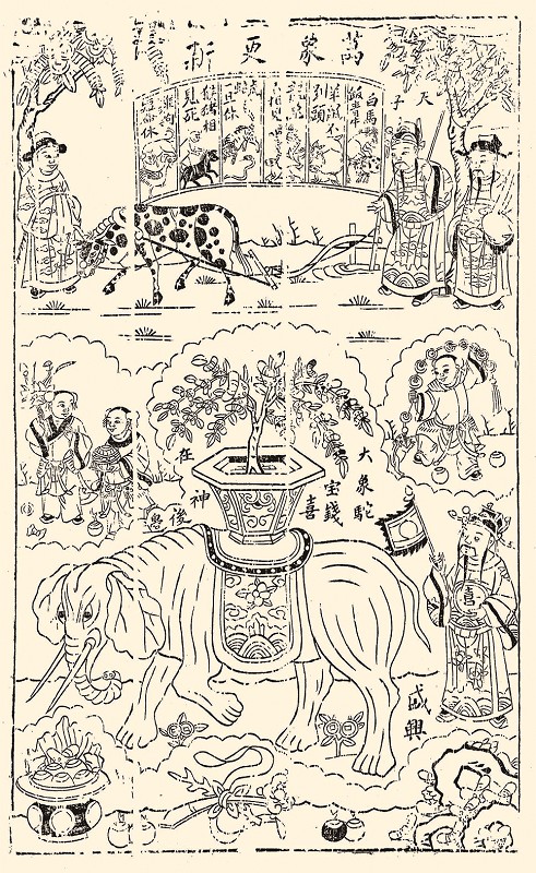 古人根据与农事有直接关系的天地运行、气候变化规律排定了中华民族的传统节日。与之相适应,武强年画的许多作品,如《正月十五龙灯大会》《高跷会》《舞狮子》等,反映了劳动人民欢度节日的场景;《万象更新》《瑞雪兆丰年》等,则表现了新一年的生活吉兆。另外,还有对应各个节日的年画题材,如立春的《打春牛》、芒种的《春牛芒神图》、二月二的《龙抬头》、三月三的《兰亭图》、五月端午的《钟馗》及《龙舟欢乐》、六月六的《八仙庆寿》、七月七的《牛郎织女》、八月十五的《大花瓶》,还有反映节气变化的《灶王龛》《九九消寒图》等农历画,皆生动描绘了我国岁时节令的不同民俗,为研究我国民俗学提供了重要的史料。