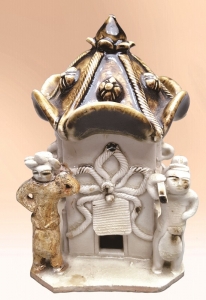 定窑黑白釉瓷轿,轿身方形。轿顶六角攒尖式,顶饰受花宝珠,六片弧形顶檐翘起;轿门挂半遮短帘,内跪坐一少妇;后帷有镂空垂叶纹窗。四名轿夫抬轿,其一头戴花冠,躯体残缺;另外三名戴幌头,系宽腰带,一手扶轿杆,一手叉腰。瓷胎细白。轿顶施黑釉,局部泛黄,其余部位施白釉,釉肥厚透明,有垂釉痕。轿体、轿夫加点黑彩。色彩对比鲜明,人物刻画简洁、生动。