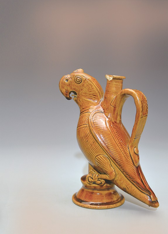 定窑黄釉鹦鹉壶,陶胎呈黄褐色,质粗松。通体施黄釉,釉色黄而莹润亮泽,作鹦鹉形。鹦鹉立于覆盆状底座之上,以堆塑、刻画技法制作。钩喙为壶流,双目圆睁,头顶饰流苏。背负一长颈注,注口圆唇外翻,注颈与鹦鹉背之间安半环柄。鹦鹉体态肥壮,长尾稍翘,篦划羽纹,胸部饰斜格纹宽带,又在柄端附贴装饰。圈足底面墨书“鹦鹉”二字。此壶形象生动逼真,实用性与艺术性相结合,是北宋低温釉陶精品。