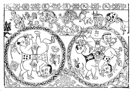 更为有趣的是出现在清代《九九消寒图》中的连体娃娃形象。图中画两个或三个娃娃,头及四肢巧妙地交错连缀,结果可被看成四个或六个(加在一起共十个)娃娃,故可名为“十子争头”,具有财源茂盛之意。这种巧妙的构成设计渊源甚古,人们欣赏画中的巧思与其吉祥寓意,因而受到广泛欢迎并在后来的年画创作中得到持续发展。以该图局部为原型的现代版《六子争头》多年来一直是武强年画中经久不衰的经典样式。 (未完待续)