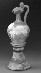 绿釉凤首陶壶,细泥红陶胎质,胎体厚重,外施一层绿铅釉。壶嘴呈桃形,带流,盖作凤首形,使得壶整体颇似一只挺立的凤鸟。颈部修长,腹上部至口沿有三棱柱形提梁一道。底座上部纤细,下部呈喇叭状向外延展,底座下部有两排附加堆纹。