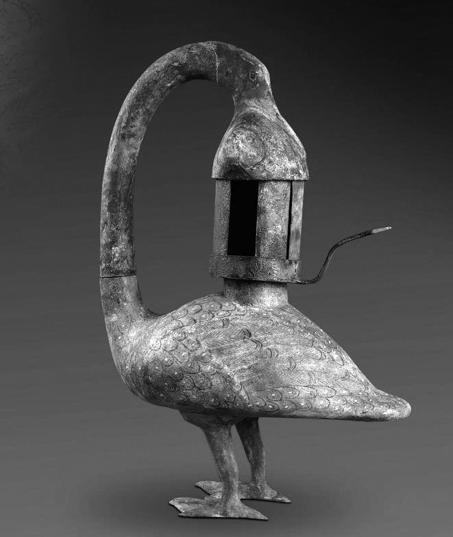 大雁和鱼的身体都是空心的,点燃灯油后产生的油烟被灯罩挡住,只能向上进入雁和鱼的体内。烟雾通过鱼和雁颈导入雁体内,防止了油烟对室内空气的污染。雁鱼灯的四个部分可自由拆装,便于擦洗。雁鱼灯构思设计精巧合理,达到了功能与形式的完美统一,是一件难得的艺术珍品。