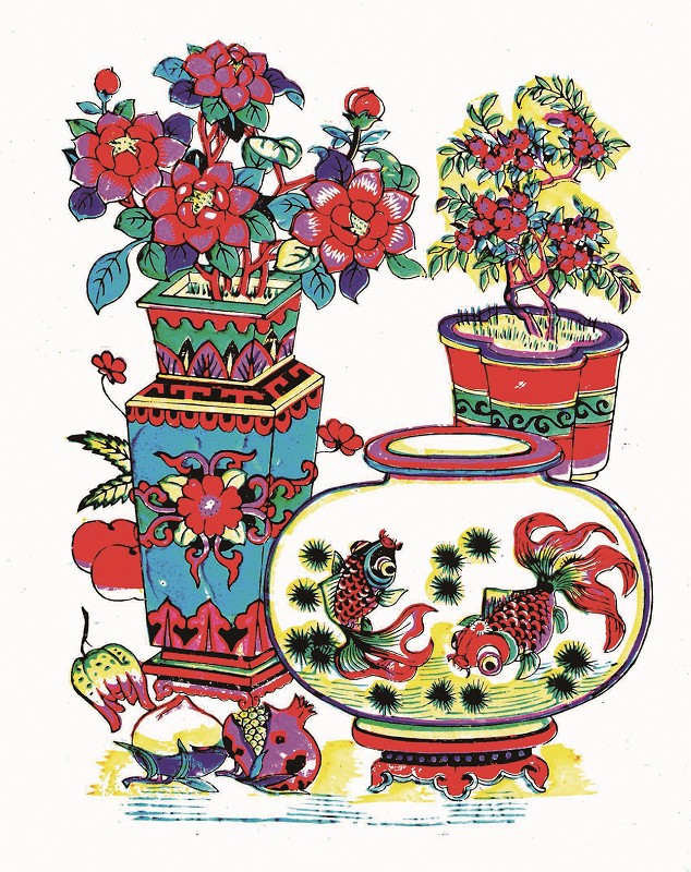 花鸟虫鱼更符合新年住室的装饰要求,因而占有较大的比重,可分为表现案头陈设和自然花鸟两大类。传统绘画中常画鼎彝古器物及花瓶盆栽、琴棋书画之类的文房清供或博古图,但武强年画却是以大花瓶为主的大幅中堂画最具代表性。插着花朵的大花瓶铺满画面空间,章法布局饱满对称,花瓶上装饰凤戏牡丹、孔雀开屏等吉祥纹样,瓶里插着寓意平安富贵或四季平安的牡丹、梅花、菊花、鸡冠花等花卉;案上陈列有成摞的书卷、切开的西瓜,盘中有桃子、佛手、石榴,象征诗书传家以及多福、多寿、多子;还有鲜嫩的莲藕、黄瓜等蔬菜之类,也寓有聪明伶俐之意……一幅幅大花瓶以醒目的篇幅囊括了大众多种多样的美好意愿。