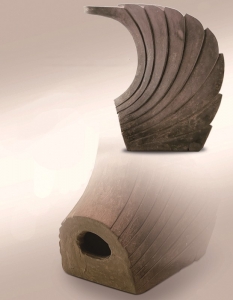 鸱尾为泥质灰陶,模制。鸱尾为用于古代建筑正脊两端的建筑构件。立面大致呈“C”形,表现的是鸱鸟尾部上扬的形态。其与正脊衔接一段立面呈半椭圆形,中间有一圆形榫孔,另一侧上部有一小圆形孔。