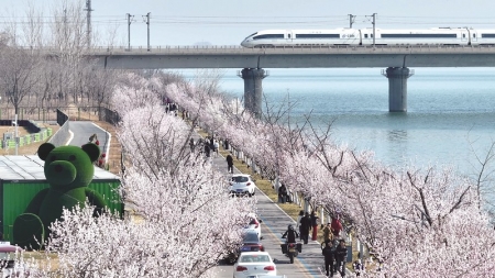 春风拂岸,花满长堤。连日来,石家庄滹沱河艺术生态岛畔,一列列疾驰的列车穿行在桥上,桥下碧波荡漾、繁花似锦。这一方胜景让这里毫无悬念成为城市新晋网红打卡地。
