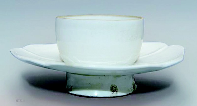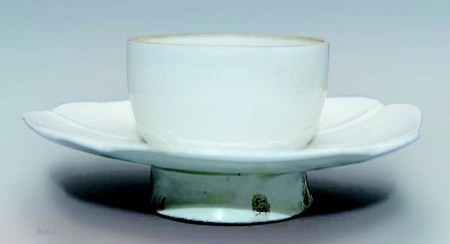 定窑白釉“官”款花式盏托,胎薄质细,釉白匀净,闪青,有垂浆泪痕,芒口毛足。五曲花瓣形高足盘上接一深腹碗,碗下腹稍鼓,折为平底,盘弧形翘起,高足外撇,内有一行书“官”字款。