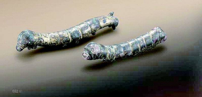 鎏金铜蚕,铜质,鎏金多脱落。头、胸、腹三部分刻画精致。全身含首尾共有9个腹节,腹下小足完整,头微昂。一只身下贴地,尾微翘;一只前腹下贴地,后腹微拱,尾沾地,整体呈波浪律动状。两只铜蚕均体态圆润可爱,刻画逼真,或为蠕动吐丝状态下的蚕,尤其头部器官刻画精细写实,灵活生动。