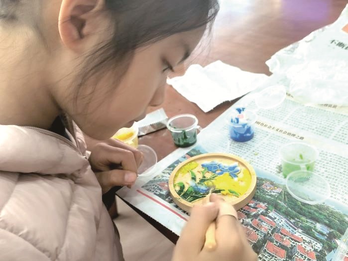 衡水市枣强县第四小学一年级学生刘若琳,亲手完成掐丝珐琅画与木版年画制作。调砂时精准把控水量,沿线稿细心粘贴金丝,再填砂、刮边,每一步都考验耐心。当专属掐丝珐琅杯垫完成,她兴奋地说:“自己动手做工艺品真有趣,我喜欢这样的作业。”班主任吴凤霞表示,此项作业将非遗探究融入寒假生活,既锻炼学生动手实践能力,又培养了耐心与专注力。
