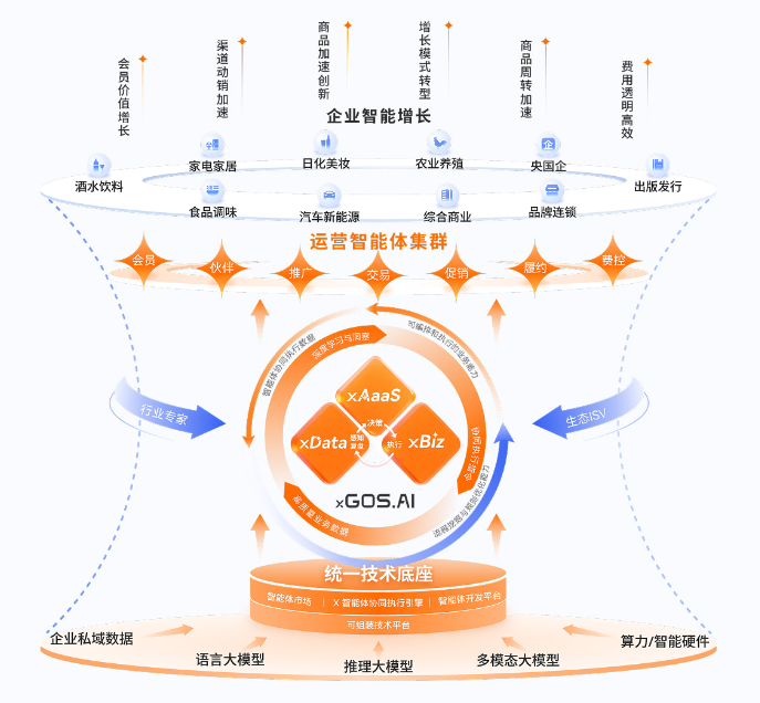 xGOS.AI,作为“企业智能体的总管家”,具备“感知-决策-执行-反馈”的智能运营能力,其独创的“一体两翼”架构——以xAaaS策略智能为“大脑”,以xBiz业务智能和xData数据智能为“两翼”,三者之间构成紧密的数据智能与业务价值“双向驱动”闭环,通过产品、解决方案以及生态体系“三线齐飞”,共同作用于企业运营,赋能企业营收增长、效率提升与成本优化,驱动可预测、可监控、可衡量的业务成果实现。
